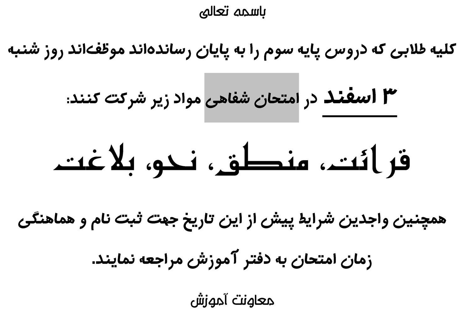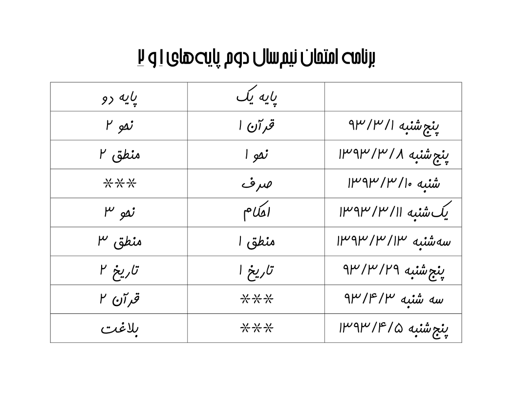 با توجه به نزدیک شدن زمان امتحان نوبت نیمسال نخست، برنامه امتحانی پایههای مختلف این حوزه به این شرح اعلام میشود.